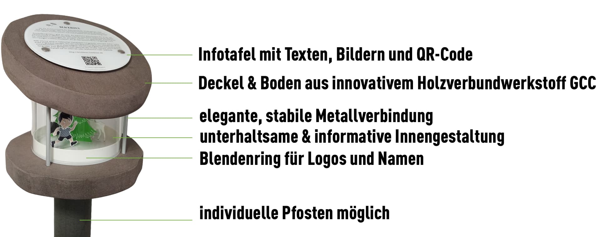 Die Outdoorvitrine "Blickboxx" besteht aus einem spritzwassergeschützten Acryl-Container, der auf einem waagerechten GCC-Boden steht und mit einem 30° geneigten GCC-Deckel abgedeckt wird. Auf dem Deckel ist eine individuell bedruckbare Acryl-Texttafel montiert. Boden und Deckel werden durch 4 Edelstahl-Gewindestäbe mit Aluminiumhülsen verbunden.